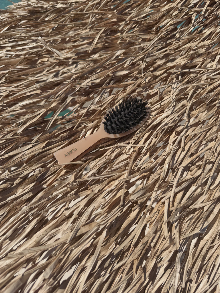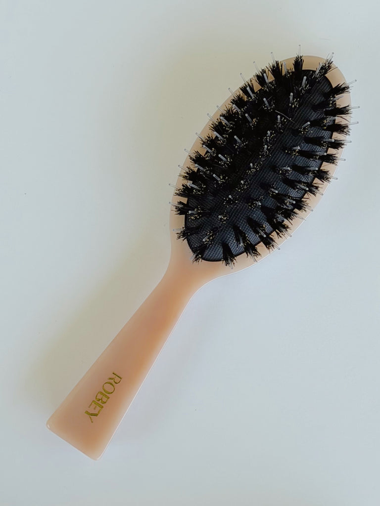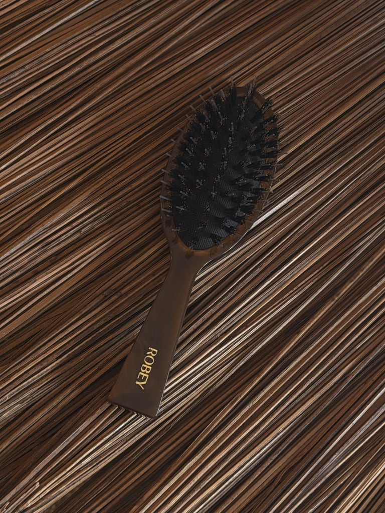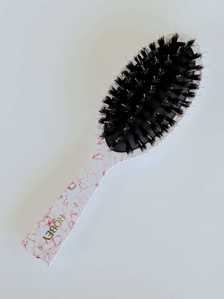 The ultimate blend of luxury and performance, from smooth Slickback to get out the tangles of salty knots. the ROBEY Everyday Hair Brush is designed to elevate your daily routine. Crafted with a unique combination of boar bristles and high-quality nylon, this brush delivers the perfect balance: the boar bristles condition and smooth the hair, while the nylon bristles gently detangle — restoring dry, damaged strands with every stroke. Unique design of bristles to stimulate hair growth whilst detangling.