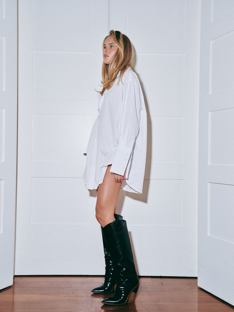 This impeccably tailored shirt dress in organic cotton is the ultimate year-round staple. With its elevated details—oversized cuffs and a flawless cut—it transitions effortlessly from casual to formal. Made from premium hundred percent organic cotton. Wear it tucked into jeans or skirts, layered with a jacket and boots in winter, or styled solo for a chic, breezy look. Versatile to be worn as a dress, high-end, and timeless, it’s the only white shirt your wardrobe will ever need.